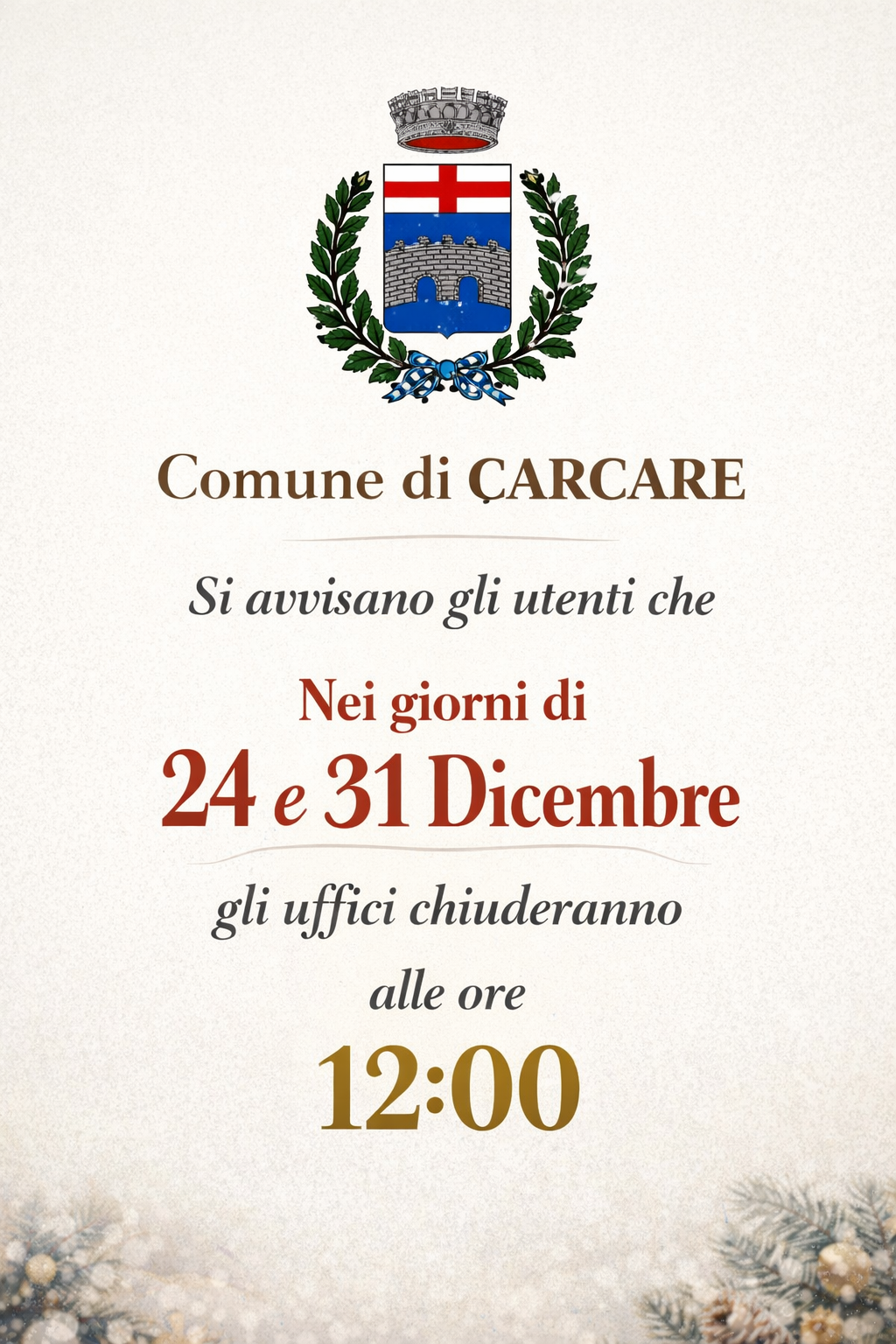 Si avvisa la Cittadinanza che nelle giornate di 24 e 31 dicembre 2025 gli uffici comunali chiuderanno alle ore 12:00